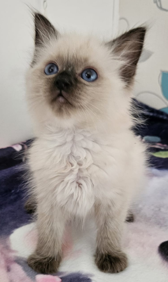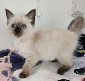 A daughter of Dennis and Button. This gorgeous little seal mitted girl is such a purr pot and always making biscuits. She is currently on the show circuit and doing quite well, she loves all the attention from the judges and will hopefully join our breeding programme in due course